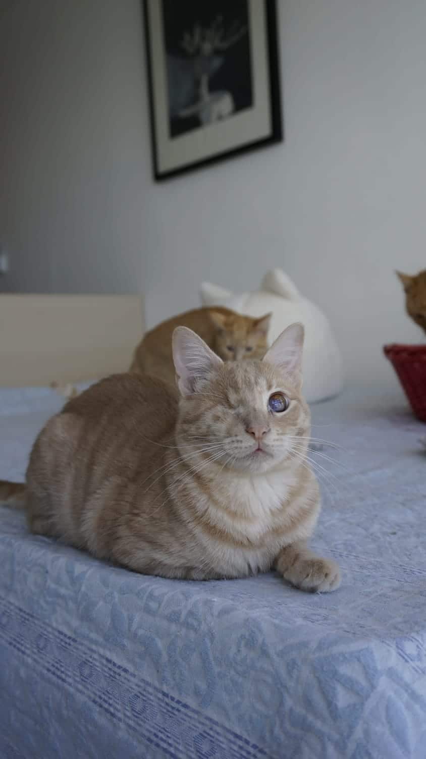 They are all less than 1 year old, & neutered. They are not clingy with hoomans but they go really well together That means; they will be fine if there is another cat in the household